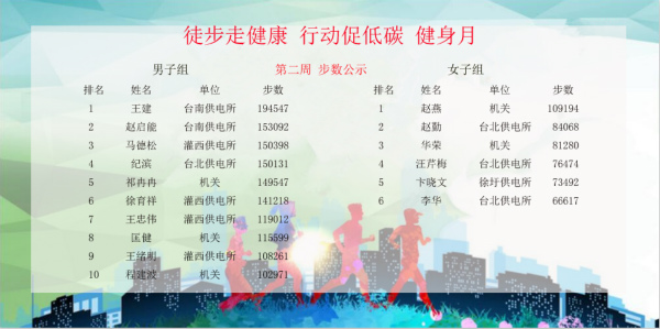 因為“微信運動(dòng)”的互動(dòng)性和競爭性,促使越來(lái)越多的職工開(kāi)始有意識地外出“走兩步”,在職工中形成了你超我趕的良好運動(dòng)氛圍,有效減少了員工開(kāi)車(chē)出行的頻率,增加了員工參與戶(hù)外活動(dòng)、親近自然的興致?;顒?dòng)已經(jīng)進(jìn)行了兩周,已有10人步數超過(guò)20萬(wàn),最高者已經(jīng)達到34萬(wàn),人均步數比活動(dòng)前增加了50%,效果十分顯著(zhù)。(電宣)