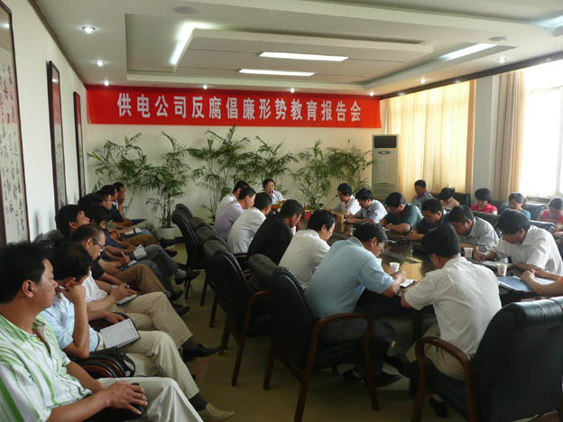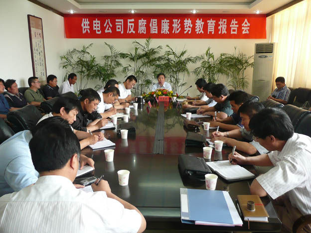 近日,我公司邀請了市紀委常委、市紀委秘書(shū)長(cháng)、市監察局副局長(cháng)雷生保同志來(lái)我公司作反腐倡廉形勢教育報告,公司領(lǐng)導、機關(guān)中層干部、各供電所領(lǐng)導班子及部分職工代表參加了會(huì )議。