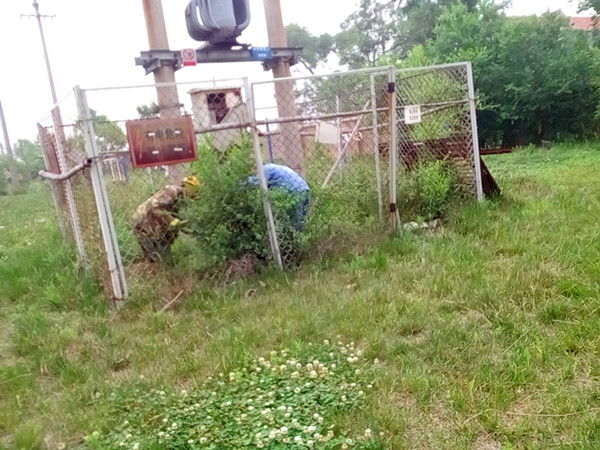 清理外置的變電設備周?chē)h(huán)境。通過(guò)夏季雨水的滋潤,外置的變電設備周?chē)L(cháng)滿(mǎn)了鹽蒿、蔓草和蘆葦。有的地方雜草叢生人不能進(jìn)入給維護造成困難,有的地方蔓草越過(guò)圍欄直接爬上電桿威脅線(xiàn)路安全,有的直接被淹沒(méi)在蘆葦叢中,不見(jiàn)了蹤影,給變電設備的環(huán)境帶來(lái)惡化和安全隱患。為此,供電所組織人員進(jìn)行全面清理,完成了16處外置的變電設備清理工作。