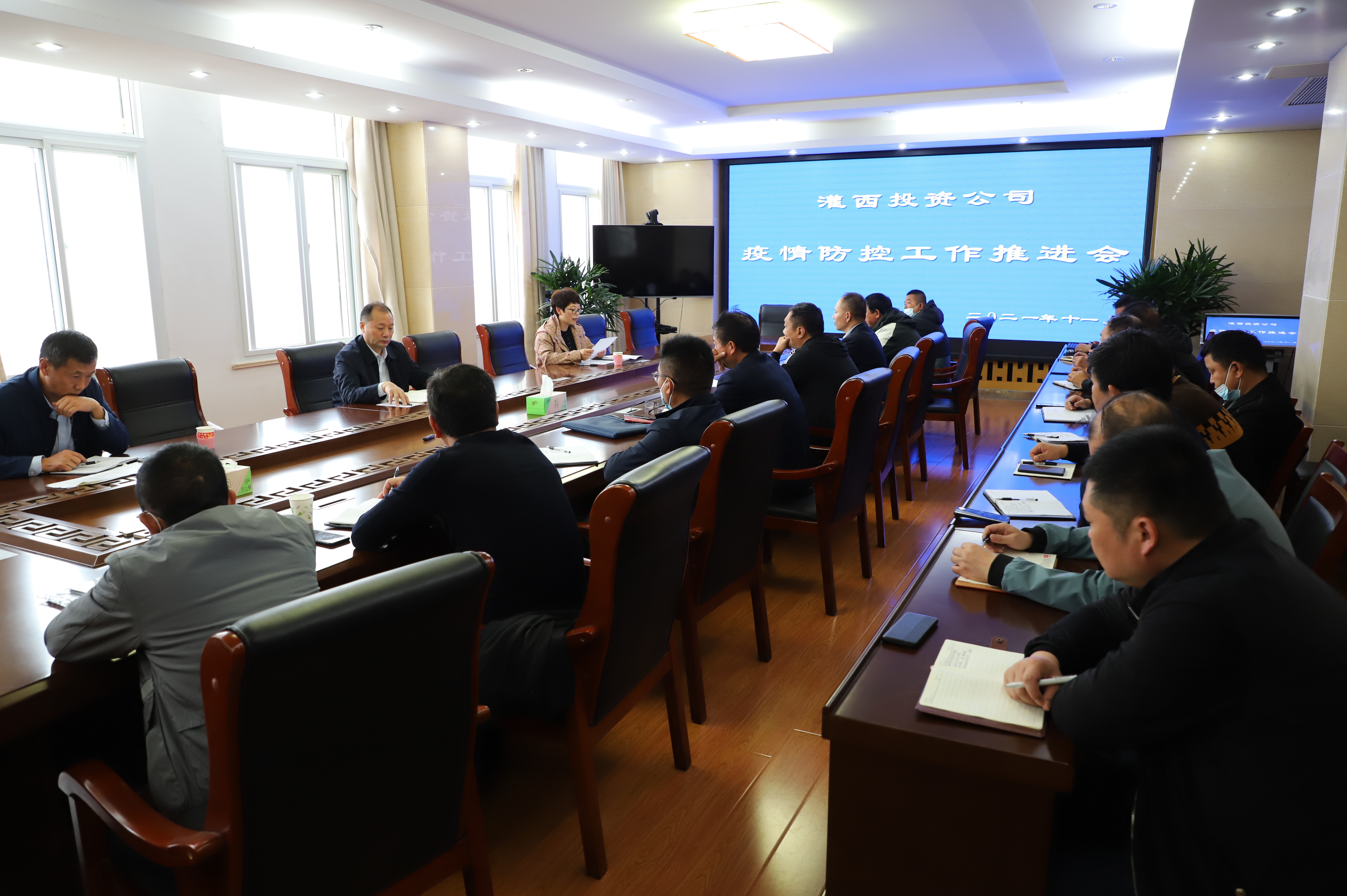 11月5日,灌西投資公司在三樓會(huì )議室召開(kāi)疫情防控工作會(huì )議,公司黨委書(shū)記、董事長(cháng)、總經(jīng)理李國文,黨委副書(shū)記、工會(huì )主席王宏及各單位部門(mén)負責人參加會(huì )議。