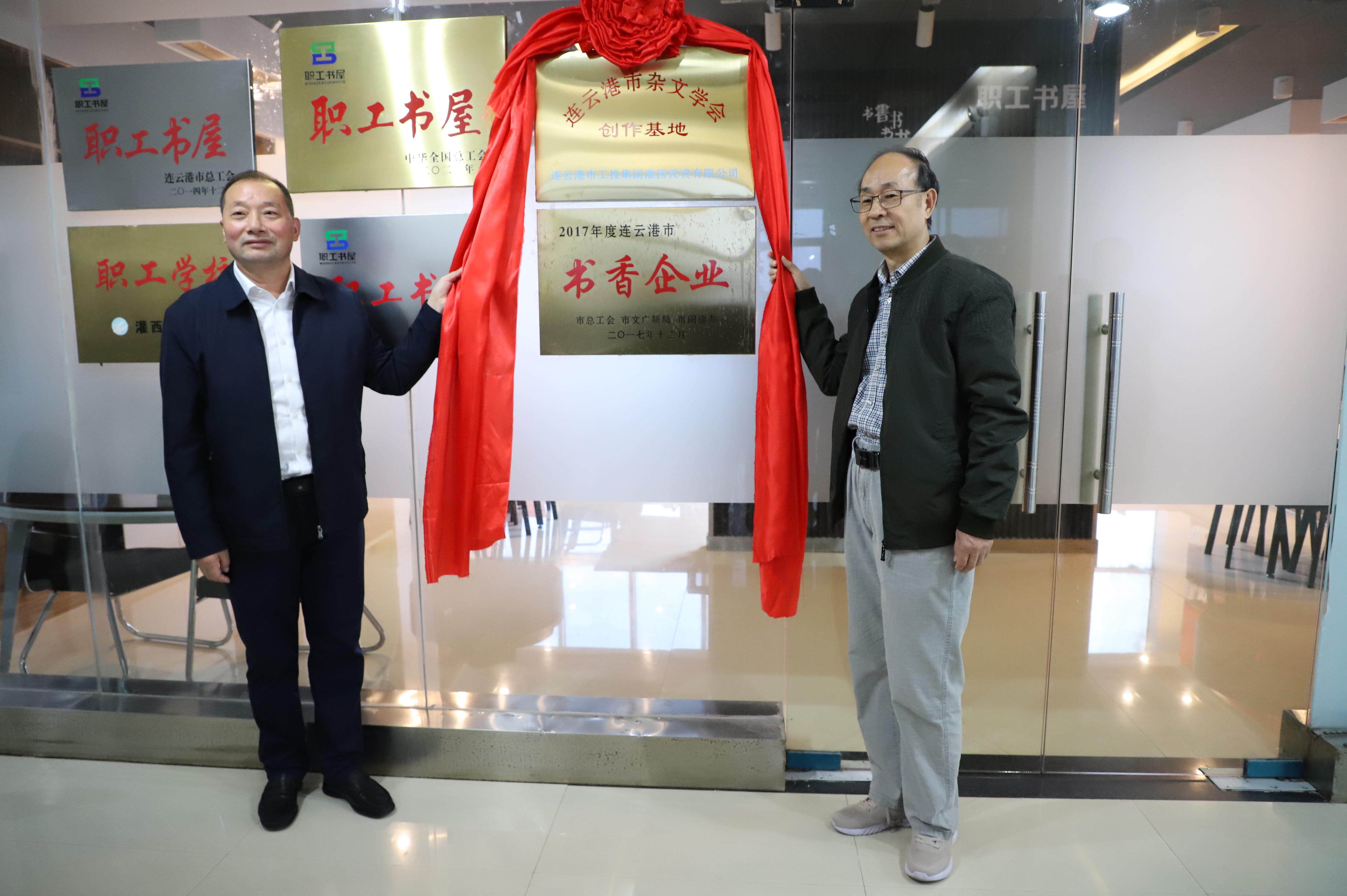 11月3日,連云港市雜文學(xué)會(huì )創(chuàng )作基地掛牌儀式在灌西投資公司職工書(shū)屋舉行,市雜文學(xué)會(huì )會(huì )長(cháng)李正冬一行為灌西公司授牌,公司黨委書(shū)記、董事長(cháng)、總經(jīng)理李國文,黨委副書(shū)記、工會(huì )主席王宏等參加掛牌儀式。