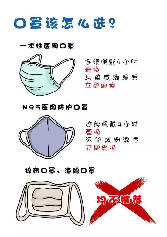 選擇二:去醫院看病或人群密集處可選用N95醫用防護口罩,連續佩戴4小時(shí)更換,污染或潮濕后立即更換。