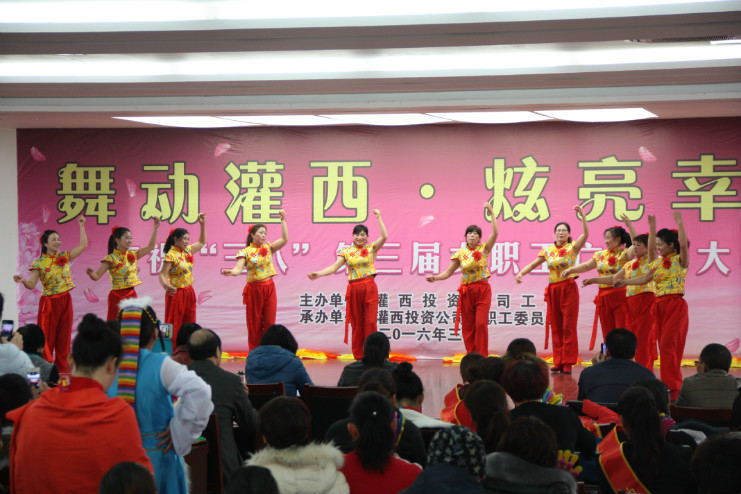 為了迎接第106個(gè)國際“三八”婦女節的到來(lái),3月8日上午,灌西投資公司舉辦了“舞動(dòng)灌西·炫亮幸福”第三屆女職工廣場(chǎng)舞大賽。這次比賽邀請了尚慶葉等七名集團公司各單位原女工主任擔任評委,做到了公平、公正,比賽成績(jì)充分顯示了各自的真實(shí)水平。來(lái)自全公司各單位共11支參賽隊伍給大家來(lái)了精彩的表演,觀(guān)看比賽的職工群眾200余人。