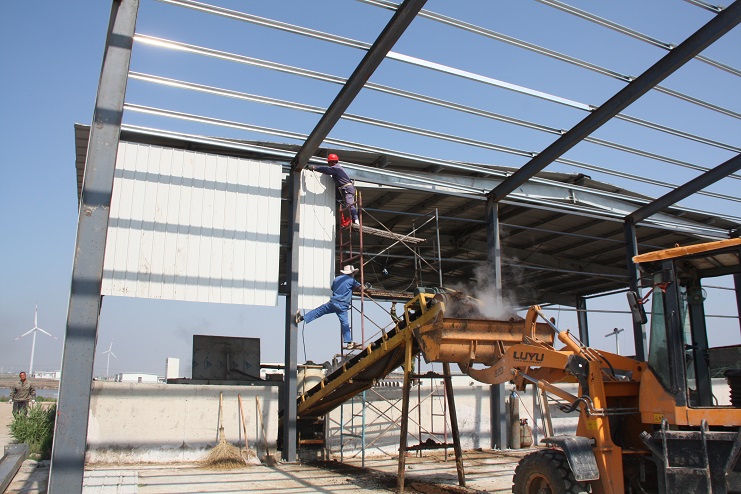 5月18日,位于北北歐農莊生豬養殖廠(chǎng)旁邊的綠淮肥業(yè)公司有機肥生產(chǎn)基地,一個(gè)鋼結構廠(chǎng)房即將完工,只見(jiàn)機聲轟鳴、焊花飛濺,機電服務(wù)公司的工人在勞模王緒華帶領(lǐng)下正在焊接鋼結構件,而正在建設施工中的廠(chǎng)房?jì)?,兩條有機肥生產(chǎn)線(xiàn)運轉不停,沒(méi)有因廠(chǎng)房建設而停產(chǎn),廠(chǎng)房旁邊的一臺挖掘機正在整平場(chǎng)地,一邊建設,不邊生產(chǎn),一派紅火景象。