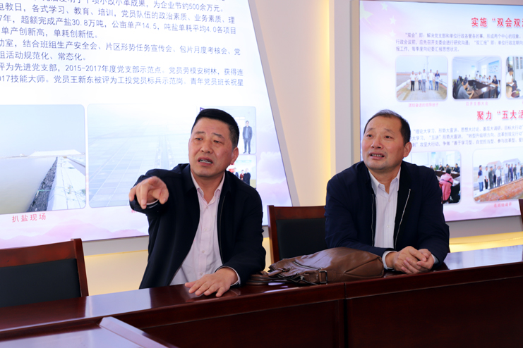 檢查組一行先后到新河制鹽分公司、老機關(guān)新建黨建室進(jìn)行實(shí)地檢查驗收,在新河制鹽分公司黨建活動(dòng)室,江舜軍部長(cháng)一行詳細聽(tīng)取了該黨支部書(shū)記李加新對黨建工作的匯報,隨后,在老機關(guān)綜合黨員活動(dòng)中心,檢查組一行利用活動(dòng)室電子顯示屏觀(guān)看了集團司歌視頻。