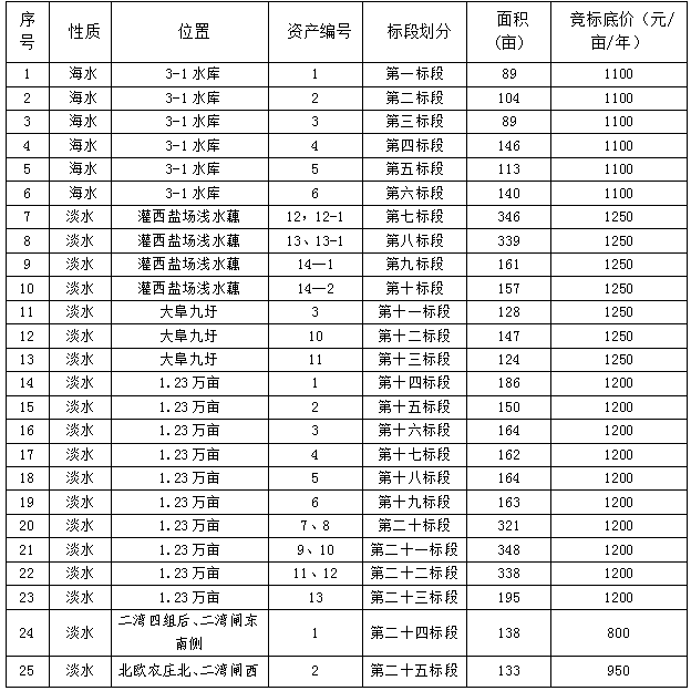 三、競租池塘各標段競標底價(jià):