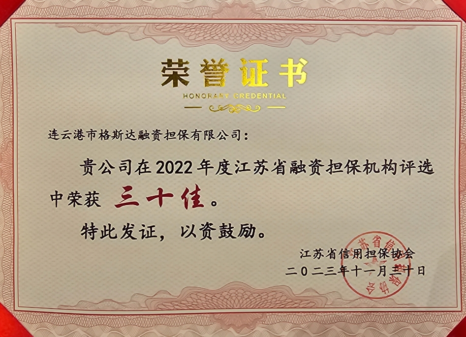 ??3月23日,江蘇省信用擔保協(xié)會(huì )在南京召開(kāi)會(huì )議。連云港市格斯達融資擔保有限公司被授予“江蘇省2022年度融資擔保機構三十佳”榮譽(yù)。本次全省共有71家融資擔保機構參加評選,格斯達擔保公司成功入選。