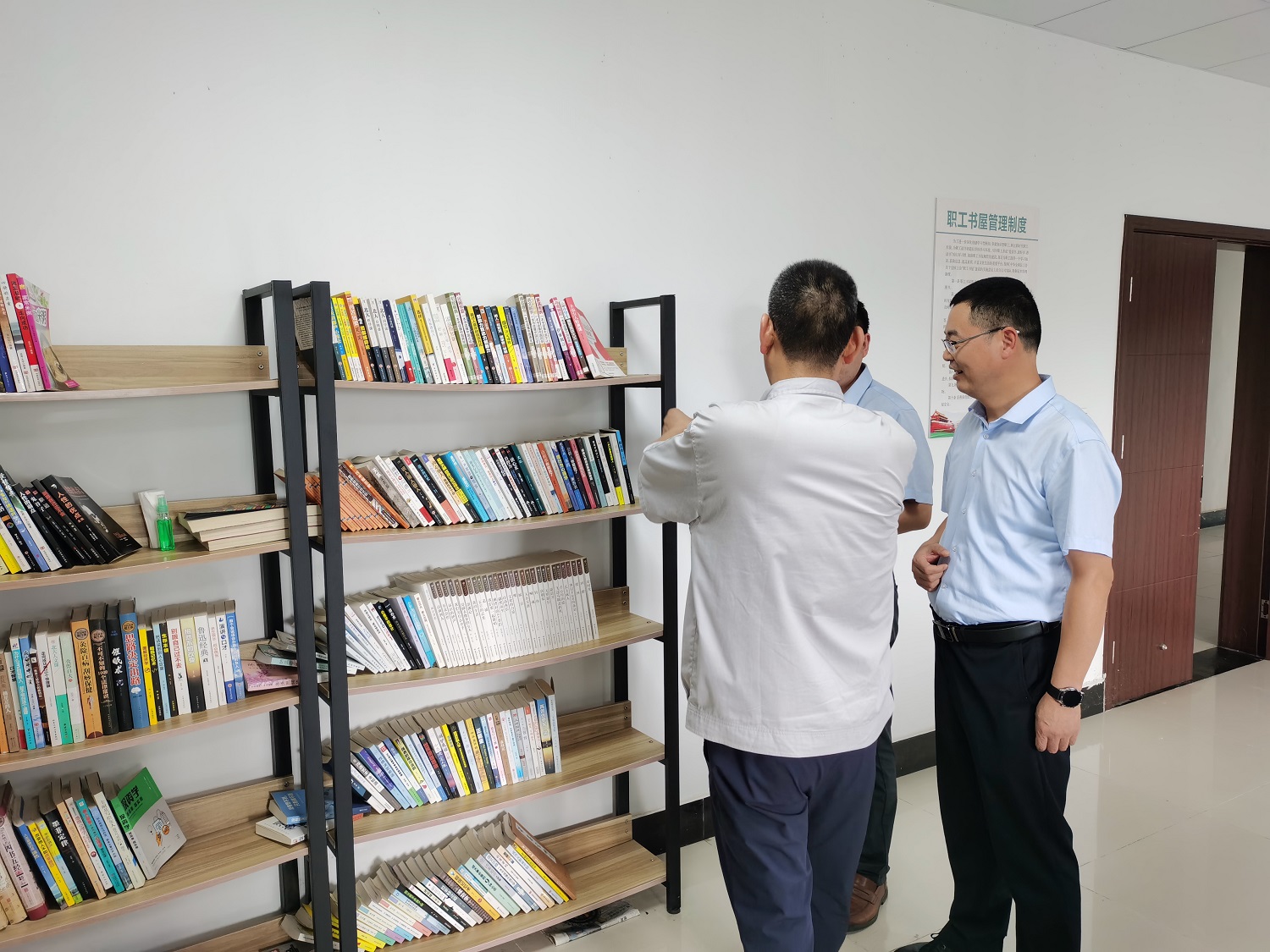 在實(shí)地參觀(guān)過(guò)程中,深入了解了書(shū)屋建設、布局、管理、圖書(shū)分類(lèi)及更新、登記等具體方面的內容,并就相關(guān)黨建、工會(huì )活動(dòng)開(kāi)展情況與神特新材料黨支部副書(shū)記、工會(huì )主席袁忠等進(jìn)行了交流討論。