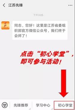 | 各單位黨群工作部: 為引導廣大黨員干部認真學(xué)習《習近平談治國理政》第三卷,推動(dòng)黨的科學(xué)理論“飛入尋常百姓家”,“江蘇先鋒”公眾號特開(kāi)辟“初心學(xué)堂”小程序,請組織本單位黨員干部8月12日—10月30日登錄“初心學(xué)堂”小程序一起聽(tīng)音頻、讀原著(zhù)、悟原理?。ㄕ埜魑稽h員登陸后,單位名稱(chēng)統一填寫(xiě)為:連云港市工業(yè)投資集團有限公司) 第一步:關(guān)注“江蘇先鋒”公眾號
