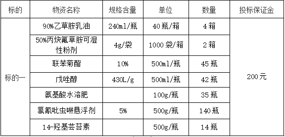 3.原則上由投標單位按貨物需求進(jìn)行投標,若規格不符,投標單位也可以根據自有包裝規格進(jìn)行投標。本次招標采購,確定生產(chǎn)廠(chǎng)家或代理商、農藥品種、規格、劑型和農藥單價(jià)。