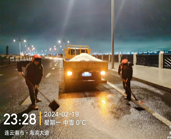 該公司迅速啟動(dòng)突發(fā)天氣應急保障預案,近30余名道路應急排險突擊隊員,在公司統一按排下 ,裝車(chē)備運融雪鹽斤近15噸,現場(chǎng)工作中隊員們士氣高漲,無(wú)所畏懼。夜間8時(shí)左右,10余名黨員先鋒,兵分三路再次安全有序奔赴燒香河、海濱大道、228等路段橋梁,無(wú)懼大風(fēng)夾著(zhù)冰雨顆粒吹打臉頰,兩人一對、三人一組、揮動(dòng)手中鐵銑,汗水與冰雨濕透橙色衣衫,經(jīng)過(guò)近4個(gè)多小時(shí)努力奮戰,人工撒放融雪鹽斤近20余噸,高質(zhì)高效保障近30座橋梁安全通暢。