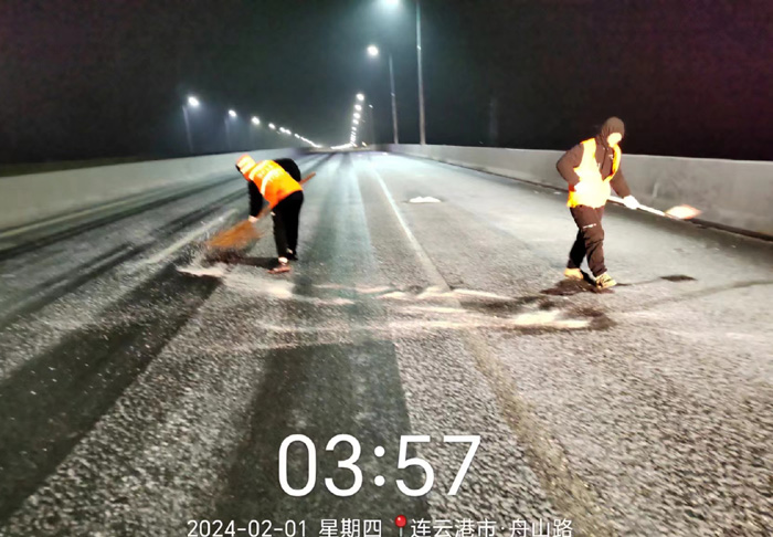 截止早上7點(diǎn),悅升公司共出動(dòng)機械設備10臺、人員260余人,對橋梁和重點(diǎn)結冰地段使用融雪劑150余噸,及時(shí)消除路面冰凍隱患100余處。